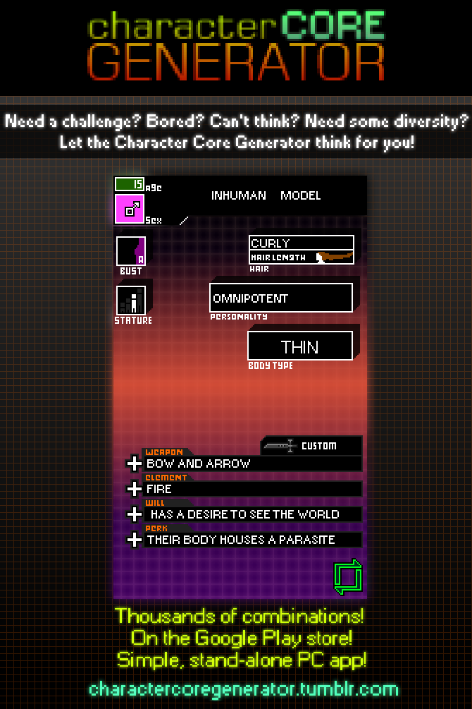 Character Core Generator$0+$0+https://schema.org/InStockusdxpisigma.tumblr.comxpisigma.tumblr.comThis app forms a unique character through random means. The result? A fun, interesting character to draw! Name a fair price:$I want this!Size2.51 MBAdd to wishlist New wishlistShareShare on XShare on Facebook Copy linkCopy product URL